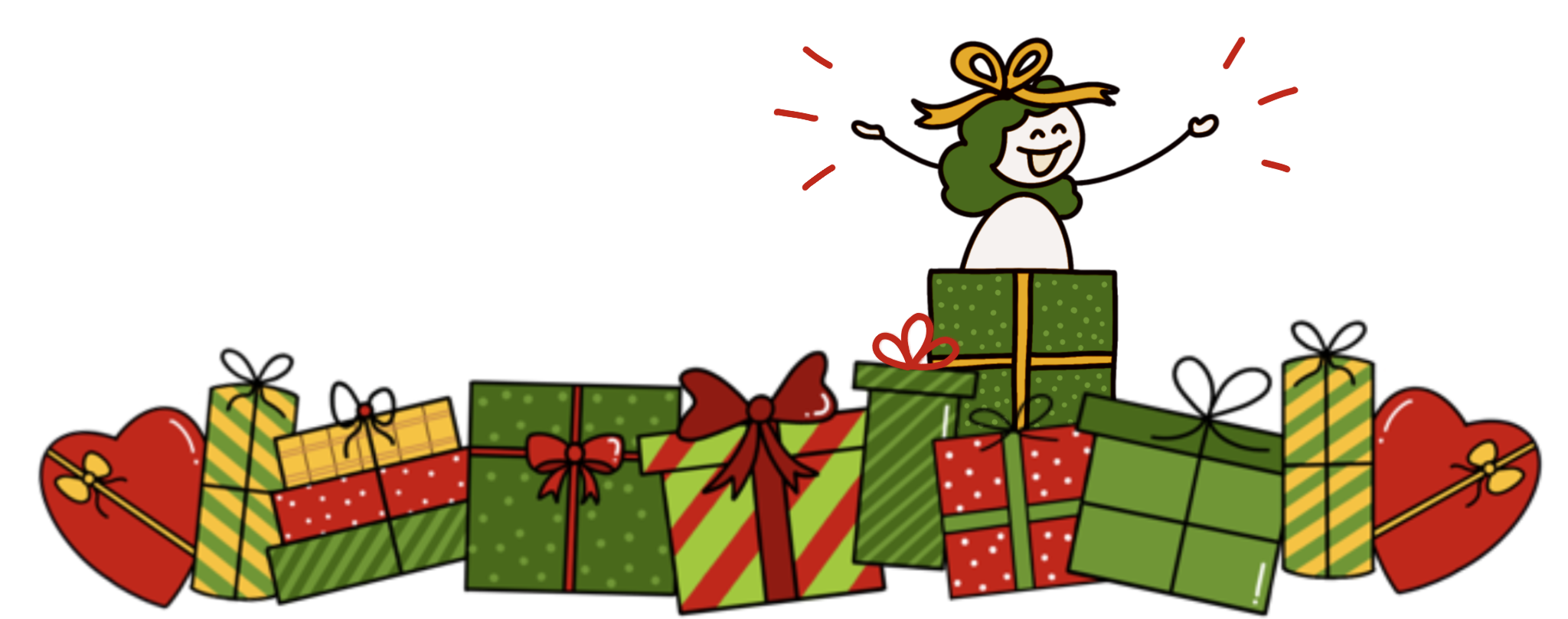 Paquets scintillants, rubans joyeux et surprises illustrées.